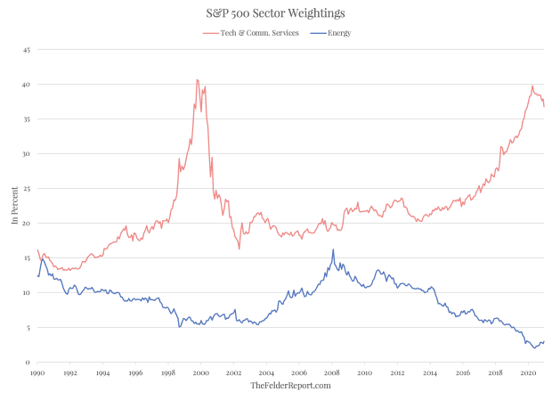 Felder pointed to the chart, above, which shows historical weightings within the S&P 500 SPX, +1.14% index. Energy has a smaller portion that it did two decades ago, at the beginning of its last major bull market. Tech and communications-services stocks are slightly below all-time highs notched at the peak of the dot-com bubble.